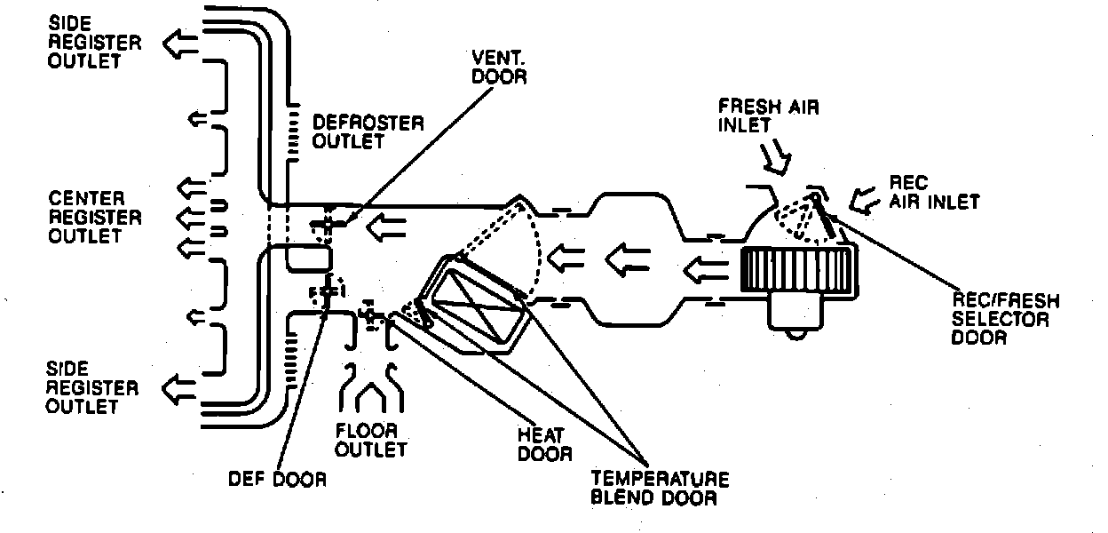 If momentary hiss can be heard when function selector lever is moved from one position to another, vacuum is available at the control assembly. Cycle the selector lever through each position with blower on HI, while checking location of discharged air. The air flow vacuum control charts, Fig. 74, indicate the vacuum motors that should be applied for each position of the selector lever along with an air flow diagram of the system.