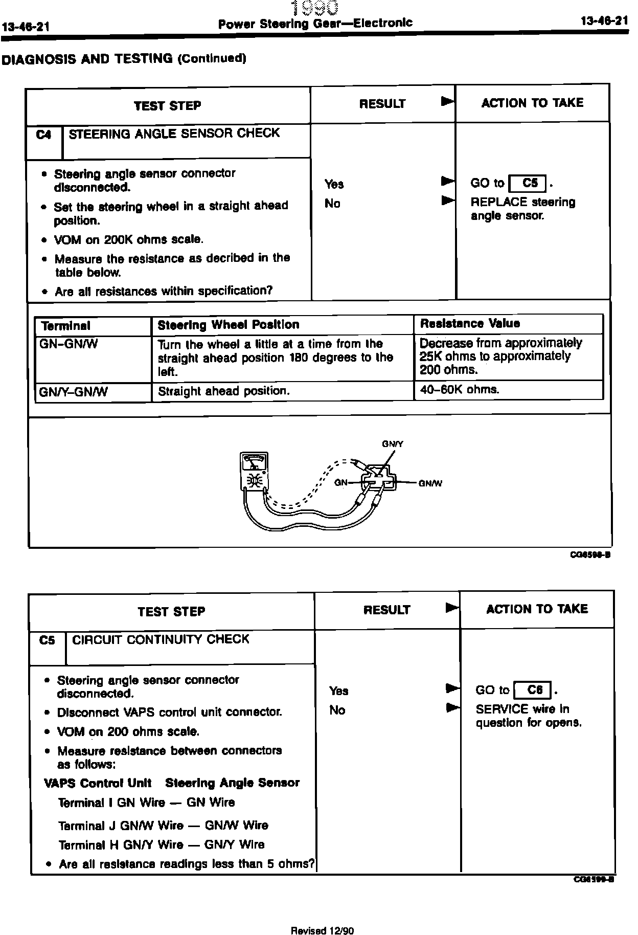 ISSUE: The resistance values in Test Step C4 Steering Angle Sensor Check on Page 13-46-21 of the 1990 Probe Shop Manual are incorrect for Terminal GN-GN/W. Test Step B3 Steering Angle Sensor Check on Page 14-39-17 of the 1990 Probe Shop Manual should indicate Terminal GN-GN/W for the Straight ahead position.