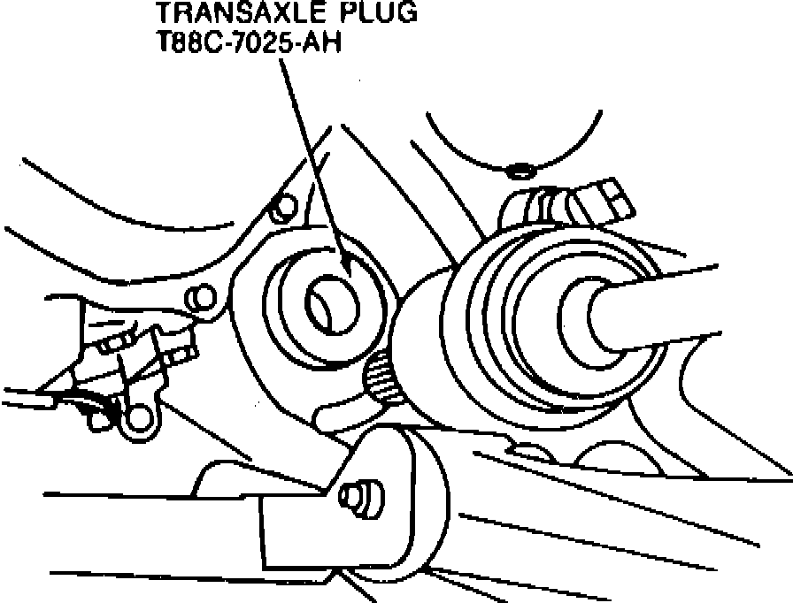 31. Install two transaxle plugs T88C-7025-AH or equivalent into differential side gears. Failure to install transaxle plugs may allow differential side gears to become mispositioned, Fig. 2.