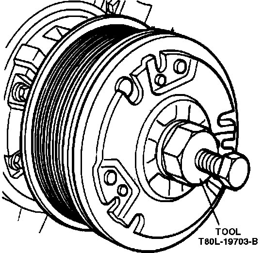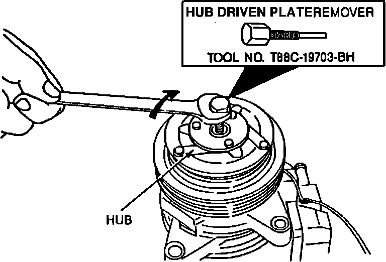 1. Remove clutch hub retaining nut using spanner wrench T81P-19623-MH or equivalent. On 10P15A compressors, use strap wrench D85L-6000-A or equivalent. It is necessary to connect field coil to a 12V source to energize the coil engaging the clutch.