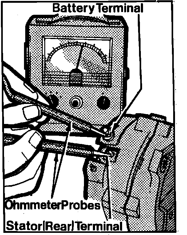 Perform the same test using the STA and GND (ground) terminals of the alternator. A reading in both directions indicates either a bad negative diode, a grounded stator winding, a grounded stator terminal, a grounded positive diode plate, or a shorted radio capacitor, if equipped.