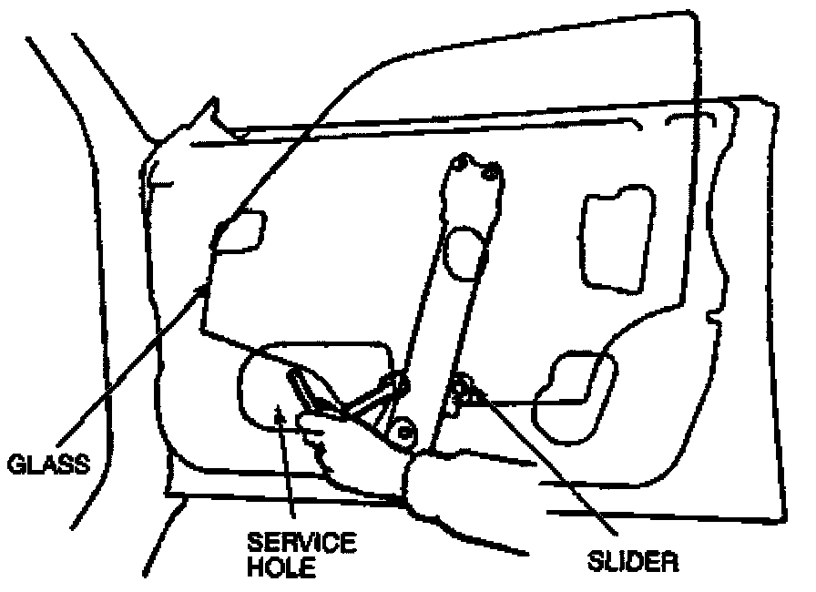 6. Position the door glass so that the nuts securing the window glass can be removed through the service hole. Remove the two retaining nuts.