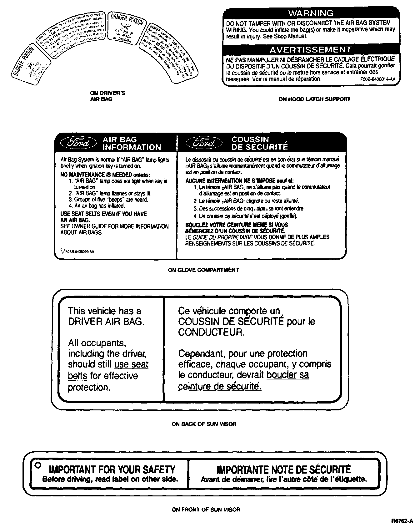 The various major assemblies in the air bag system have been designed to be tamper-resistant and are not intended to be disassembled for service. Component assemblies may be removed and replaced as required. Information on proper handling, storage, and disposal of the air bag inflator assemblies is provided. Warning labels for the air bag module are shown.