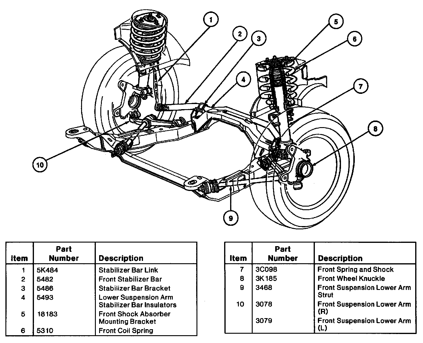 The following components may be replaced either individually or as an assembly: Gas-pressurized front shock absorber strut must be replaced as an assembly. The front shock absorber strut is not serviceable. Replace only the damaged front shock absorber strut. Front shock absorber struts are not to be replaced as sets. Front shock absorber mounting brackets (18183) may be replaced individually. Front shock absorber mounting bracket and seat assemblies may be replaced individually. Front coil springs (5310) may be replaced individually. Lower front spring insulators (5414) may be replaced individually. Front wheel knuckle (3K186) may be replaced individually. Wheel hubs (1104) may be replaced individually. Forged front suspension lower arm (3079) assemblies are replaceable with the ball joint, front suspension lower arm strut inner bushing (3C067) and front suspension strut insulator (3C078) included in the assembly. The front suspension lower arm assemblies may be replaced individually. Ball joint seals are not replaceable. Ball joint is not replaceable. Front suspension lower arm rear strut bushings (3B27 1) in the front suspension lower arm may be replaced individually. Front suspension lower arm strut inner bushings may be replaced individually. Front suspension lower arm struts (3468) may be replaced individually. Front suspension strut insulators may be replaced individually. Tension strut washers at the front sub-frame (5C145) and front suspension lower arm are replaceable with proper Ford approved hardened components. Front stabilizer bar (5482) may be replaced. Lower suspension arm stabilizer bar insulators (5493) may be replaced individually. Stabilizer bar brackets (5486) may be replaced individually. Front suspension lower arm struts may be replaced individually. Stabilizer bar link ball joints are not replaceable.