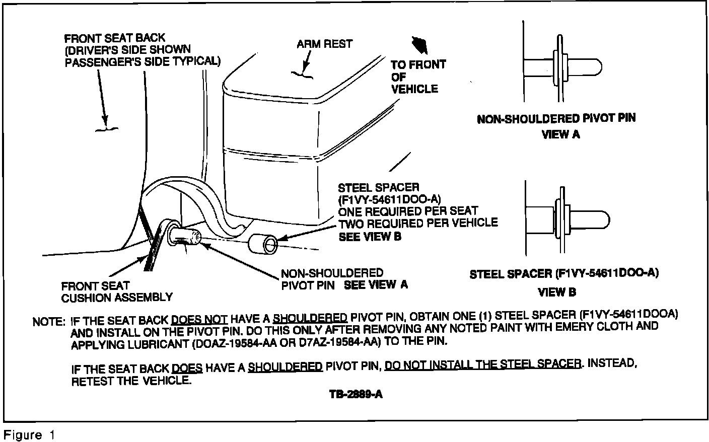 c. If the seat back does not have a shouldered pivot pin, or if a steel spacer was not previously installed on the pivot pin, perform the procedure outlined in TSB Article No. 91-15-2 (July 24, 1991). Then, re-test the vehicle.