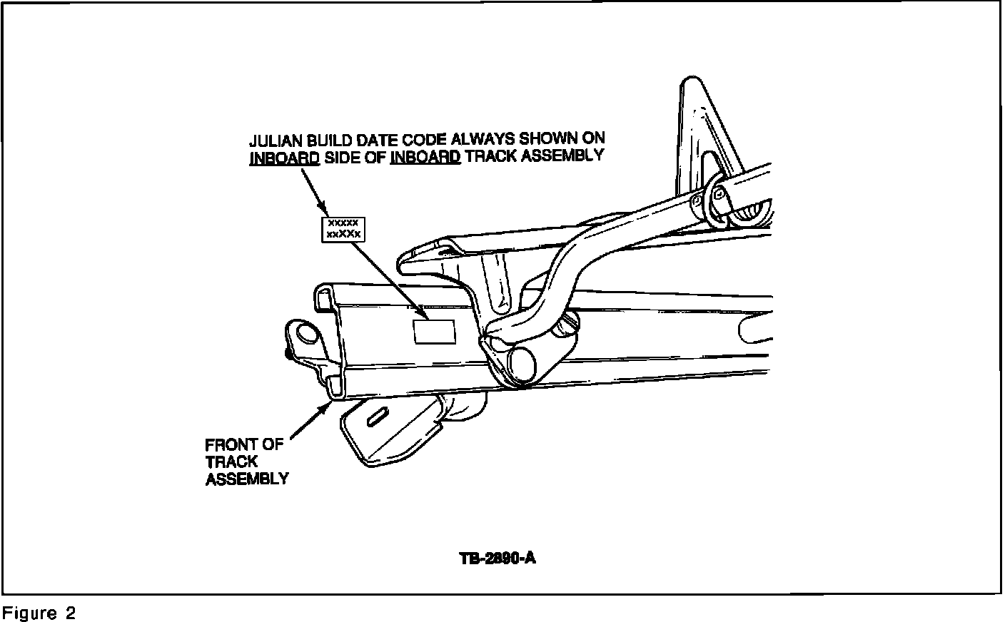 BE SURE TO RECORD THE TRACK'S JULIAN BUILD DATE CODE, WHICH IS ALWAYS SHOWN ON THE FRONT INBOARD SIDE OF THE INBOARD TRACK ASSEMBLY (SEE FIGURE 2), ON THE 1863 WARRANTY FORM.