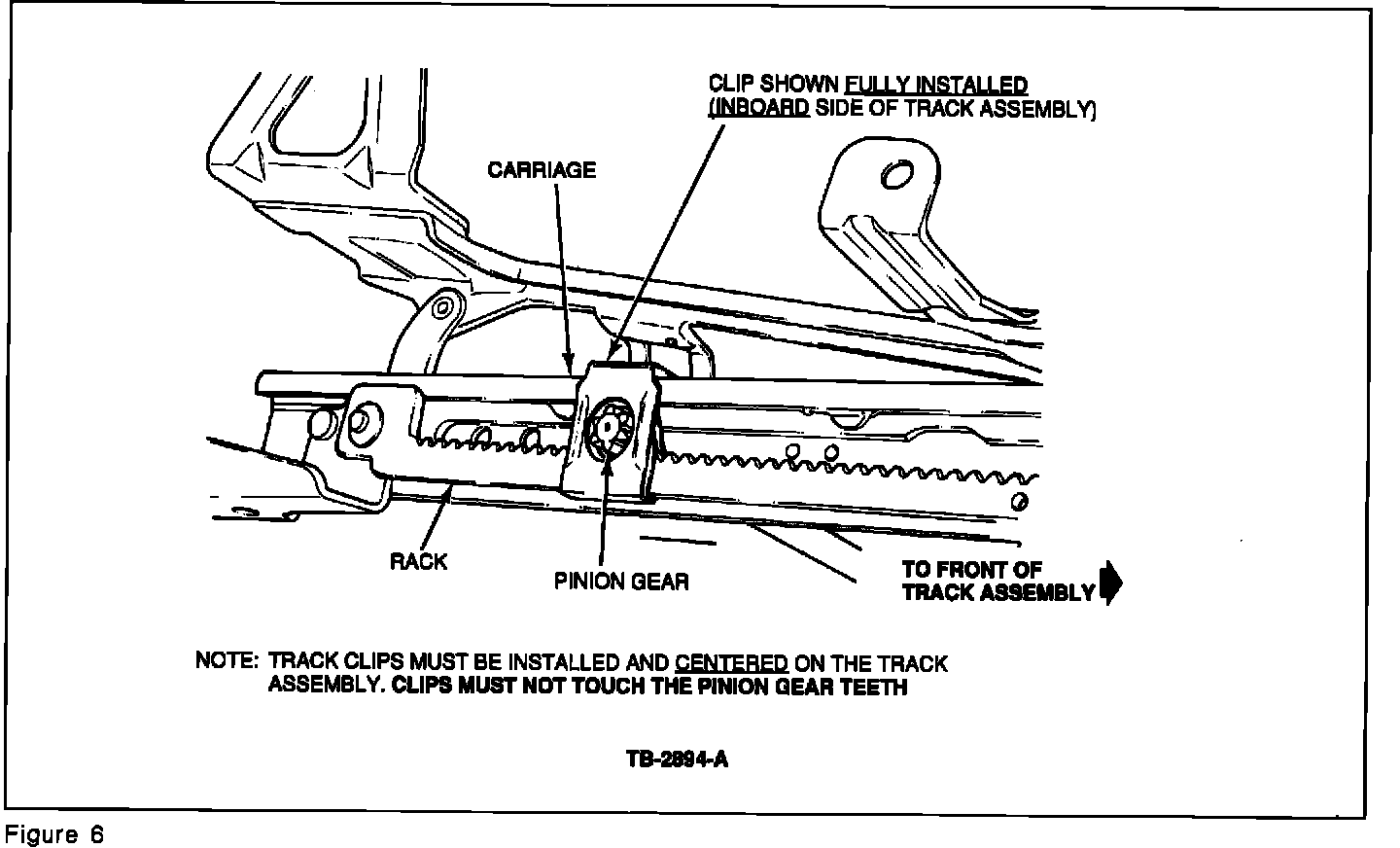 TRACK CLIPS MUST BE INSTALLED AND CENTERED ON THE TRACK RAILS AS SHOWN IN FIGURES 6 AND 7. CLIPS MUST NOT TOUCH THE PINION GEAR TEETH.
