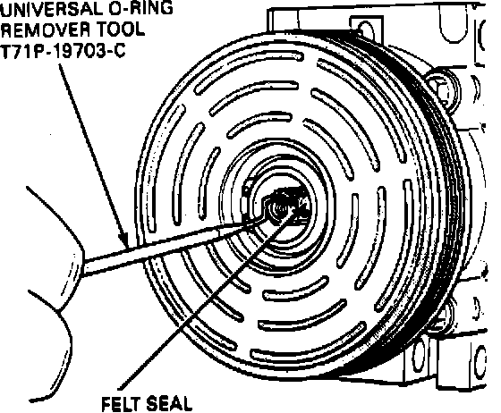 5. Remove the shaft seal felt from the nose of the A/C compressor using Rotunda Tool T71P-19703-C, Figure 2.