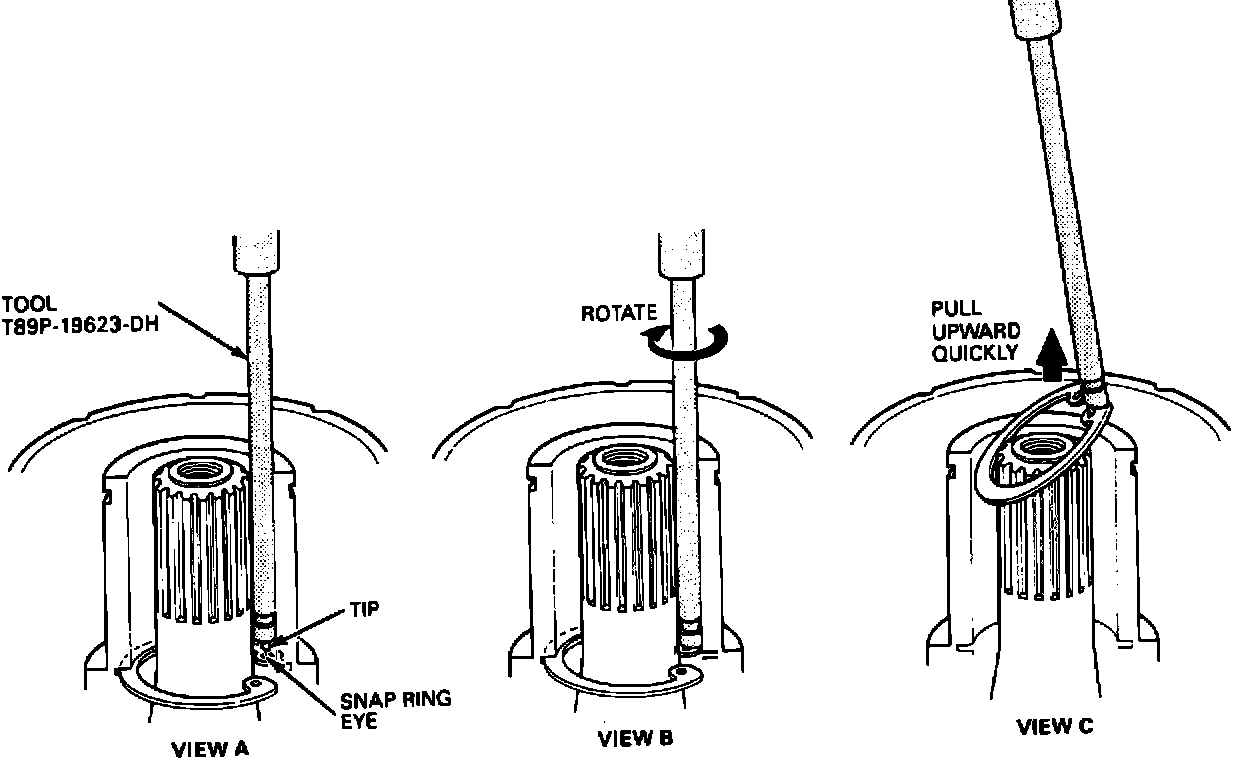 10. Push and seat the snap ring against the seal with the snap ring remover tool, T89P-19623-DH.