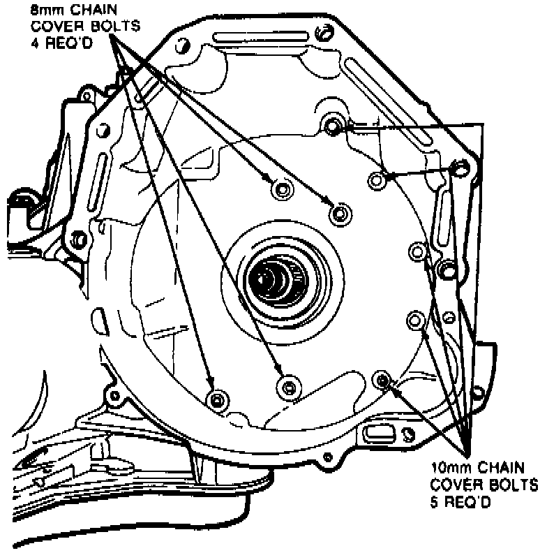 11. Remove chain cover attaching bolts from inside torque converter housing.