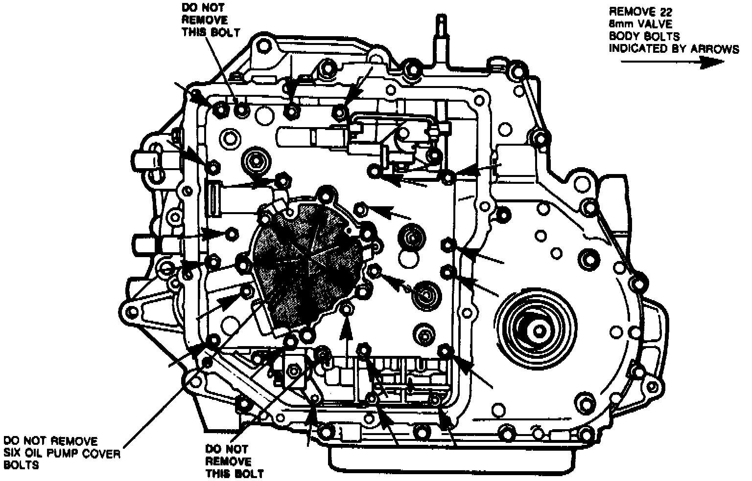 NOTE: Do not remove the two bolts that attach the oil pump and valve body assembly together. Also, do not remove oil pump cover attaching bolts.