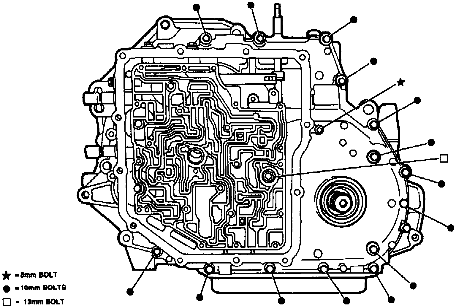 17. Remove 22 oil pump and valve body assembly attaching bolts, noting length and location of bolts.