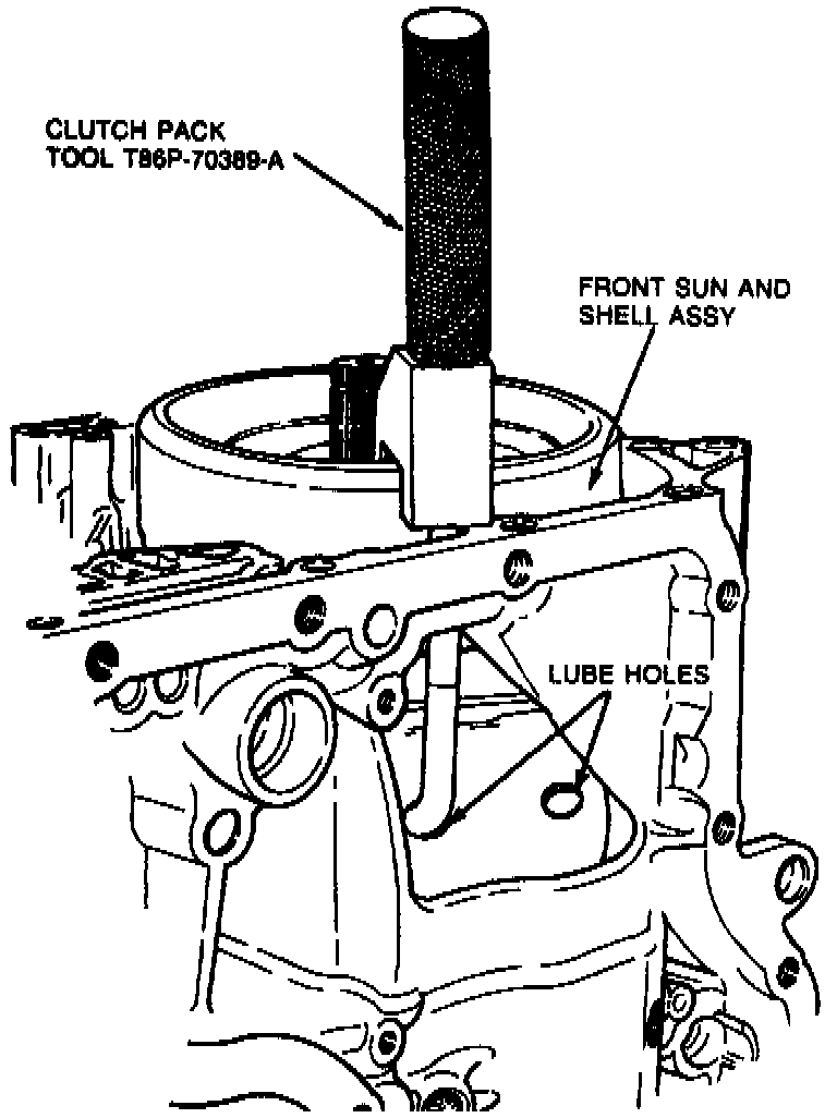 38. Install hooked end of clutch pack tool No. T86P-70389-A or equivalent into one of the six lube holes in front sun and shell assembly. Position notched block over edge of assembly and tighten handle, then lift assembly from case.
