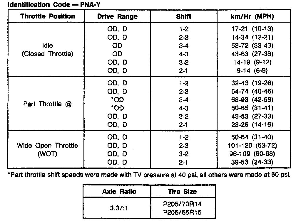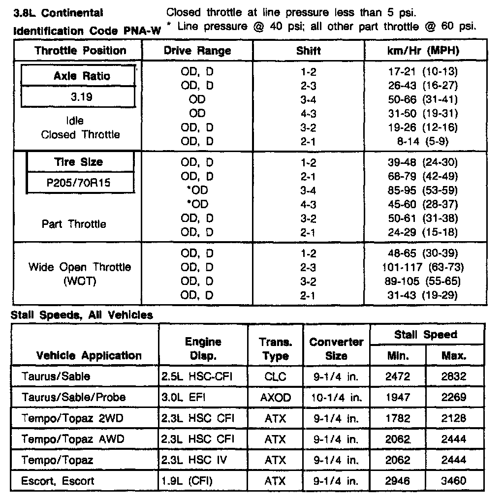 AXOD 4-spd A/T, Shift Speeds (3.0L Taurus/Sable):