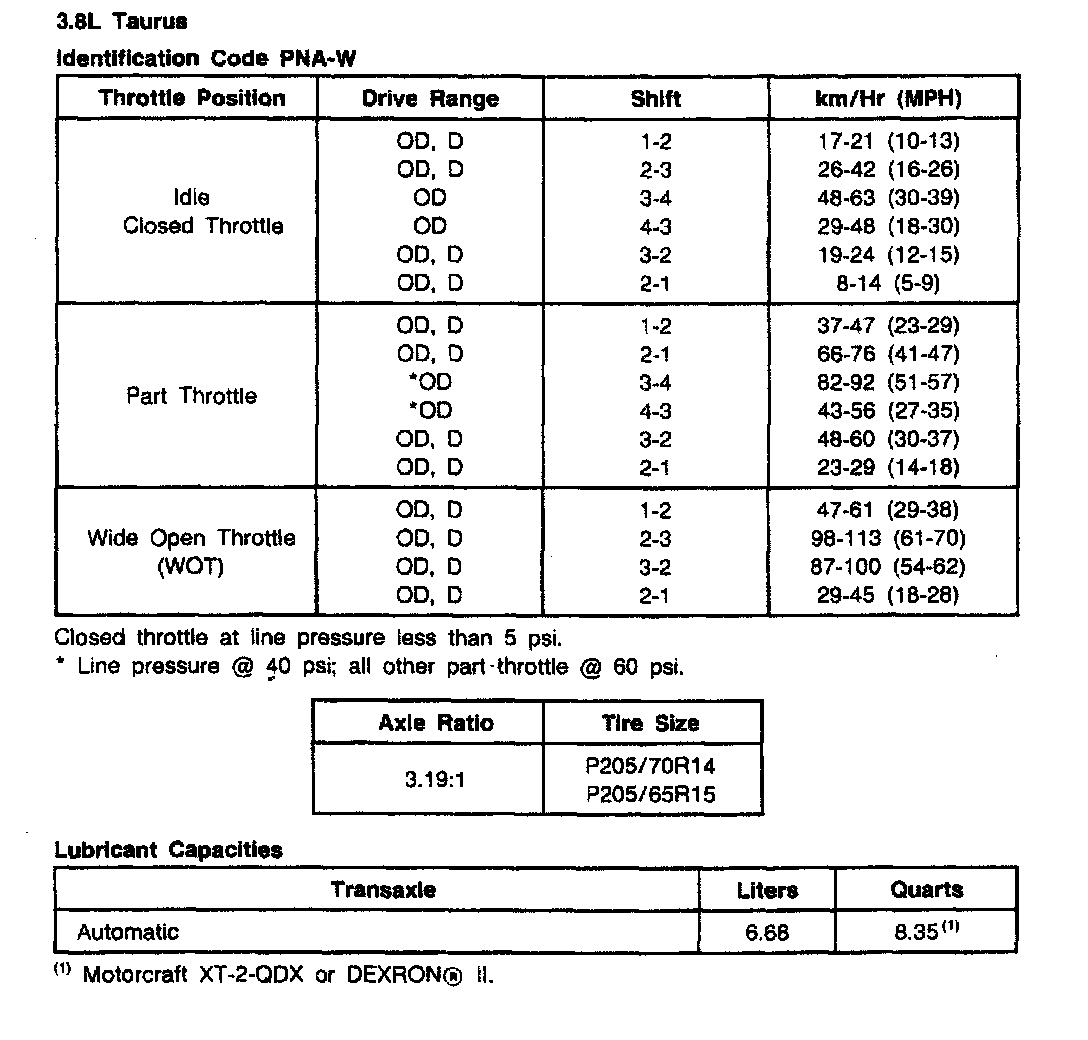 AXOD 4-spd A/T, Shift Speeds (3.8L Taurus):