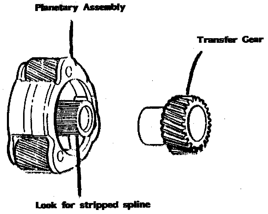 The spline length was reduced dramatically, due to other changes in the planetary. When the planetary spline is stripped, the transfer gear's inside spline is usually damaged.