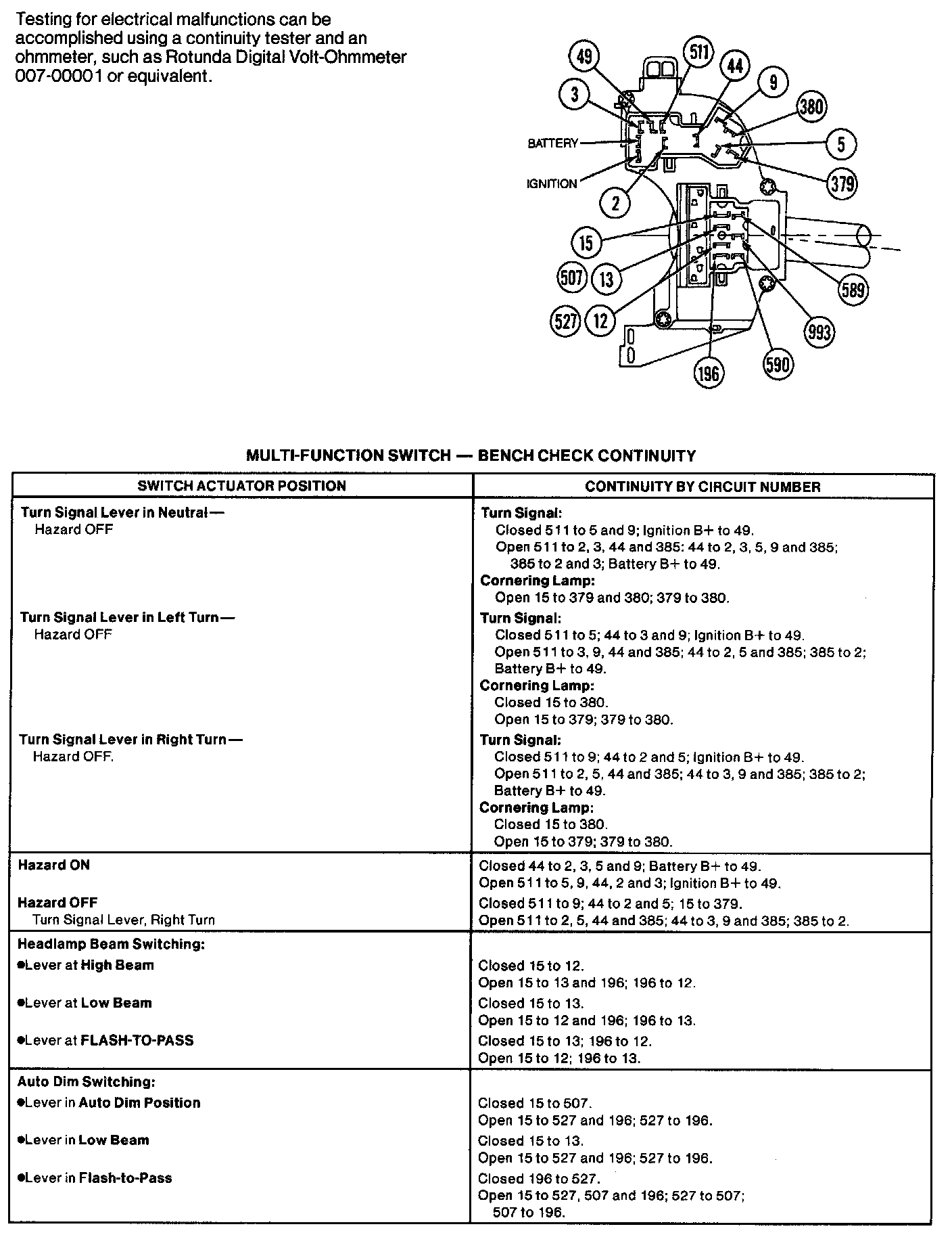 Testing for electrical malfunctions can be accomplished using a continuity tester and an ohmmeter, such as Rotunda Digital Volt-Ohmmeter 007-00001 or equivalent.