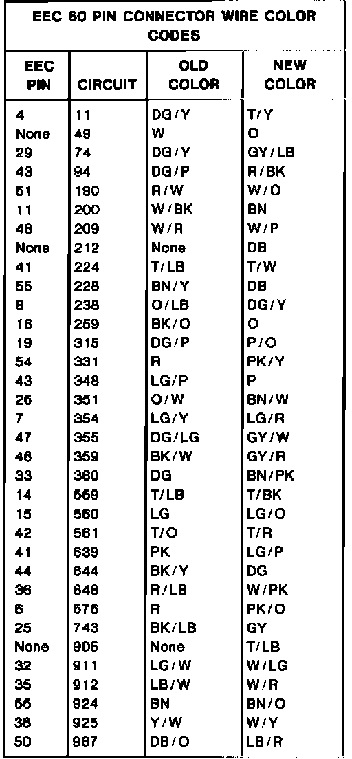 ISSUE: The wire color codes for the 60 pin EEC connector and trailer tow circuits will be changed throughout the 1990 model year. All the changes should be complete by Job # 1, 1991. These changes will make the color codes common between cars and trucks. No two colors will be the same in the 60 pin EEC connector.