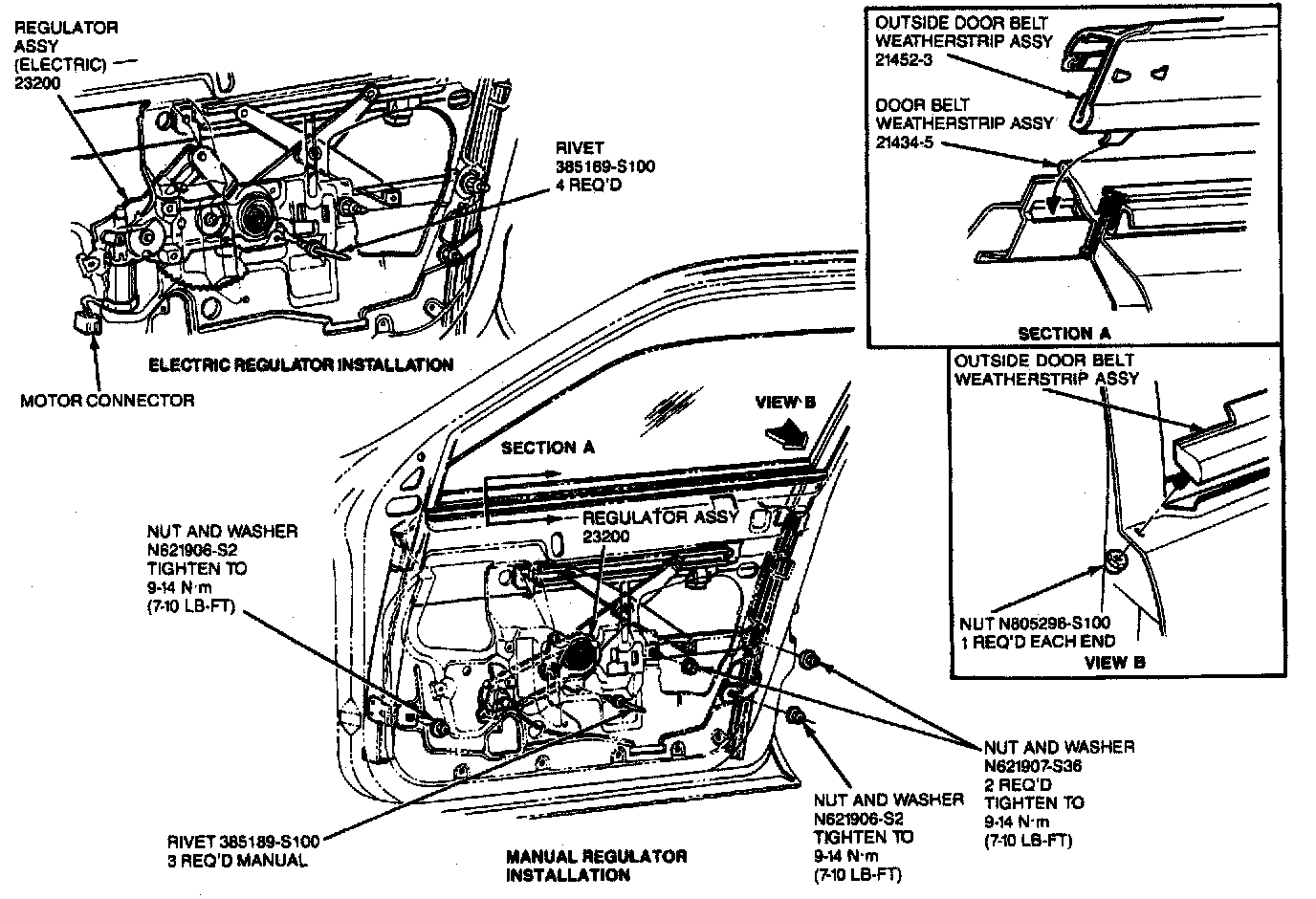 2. Install three (manual) or four (power) rivets to attach regulator to door inner panel.