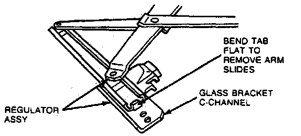 8. Install new regulator arm plastic guides into glass bracket C-channel and bend tab back to 90 degrees (use care not to break tab, if tab is cracked or broken, replace glass bracket assembly. Ensure rubber bumper is installed properly on new glass bracket, if replacement is made).