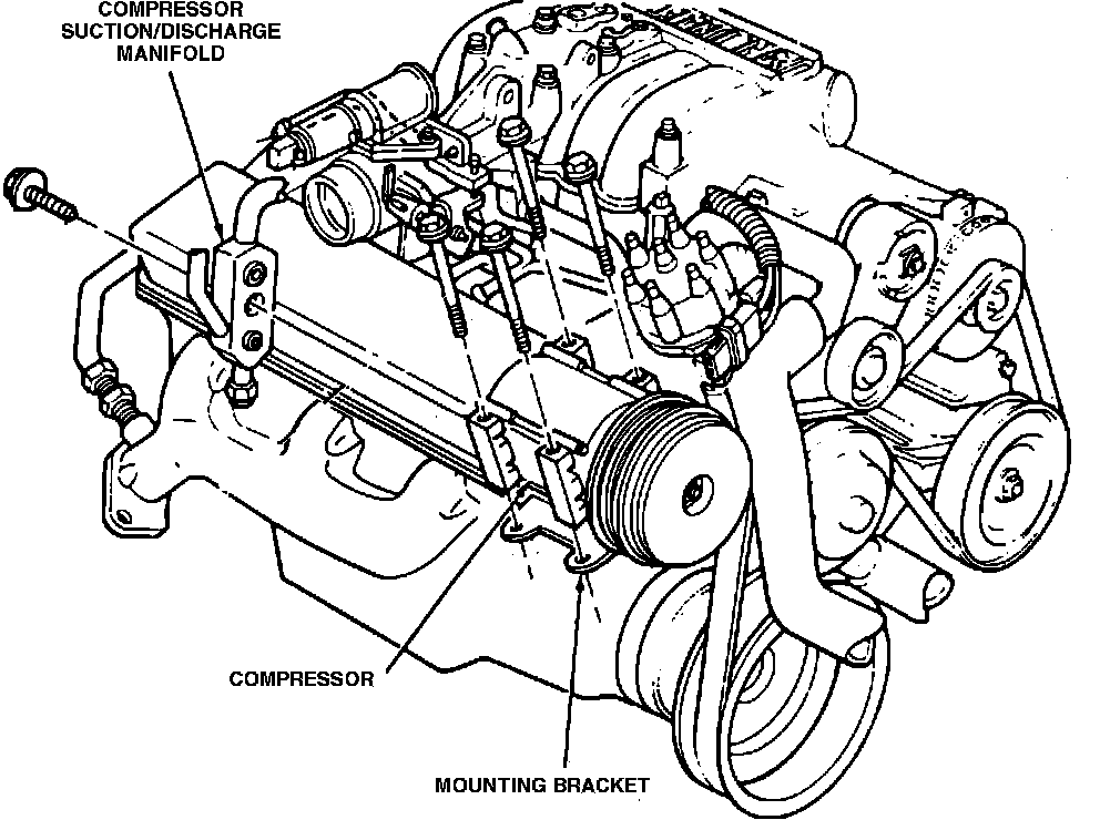 5. Remove discharge and suction manifold from compressor. Cap refrigerant lines and compressor manifolds to prevent contamination.