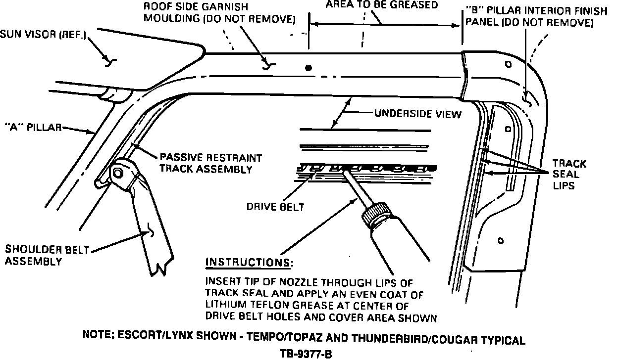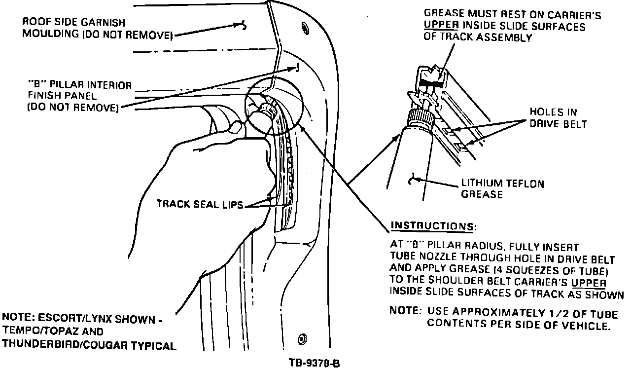 ACTION: Apply about 0.25 oz. of lithium/teflon grease to the track assembly. This can be done without removing the "B" pillar's interior roof side mouldings or the "B" pillar finish mouldings. Refer to Figures 1 & 2 for service details.