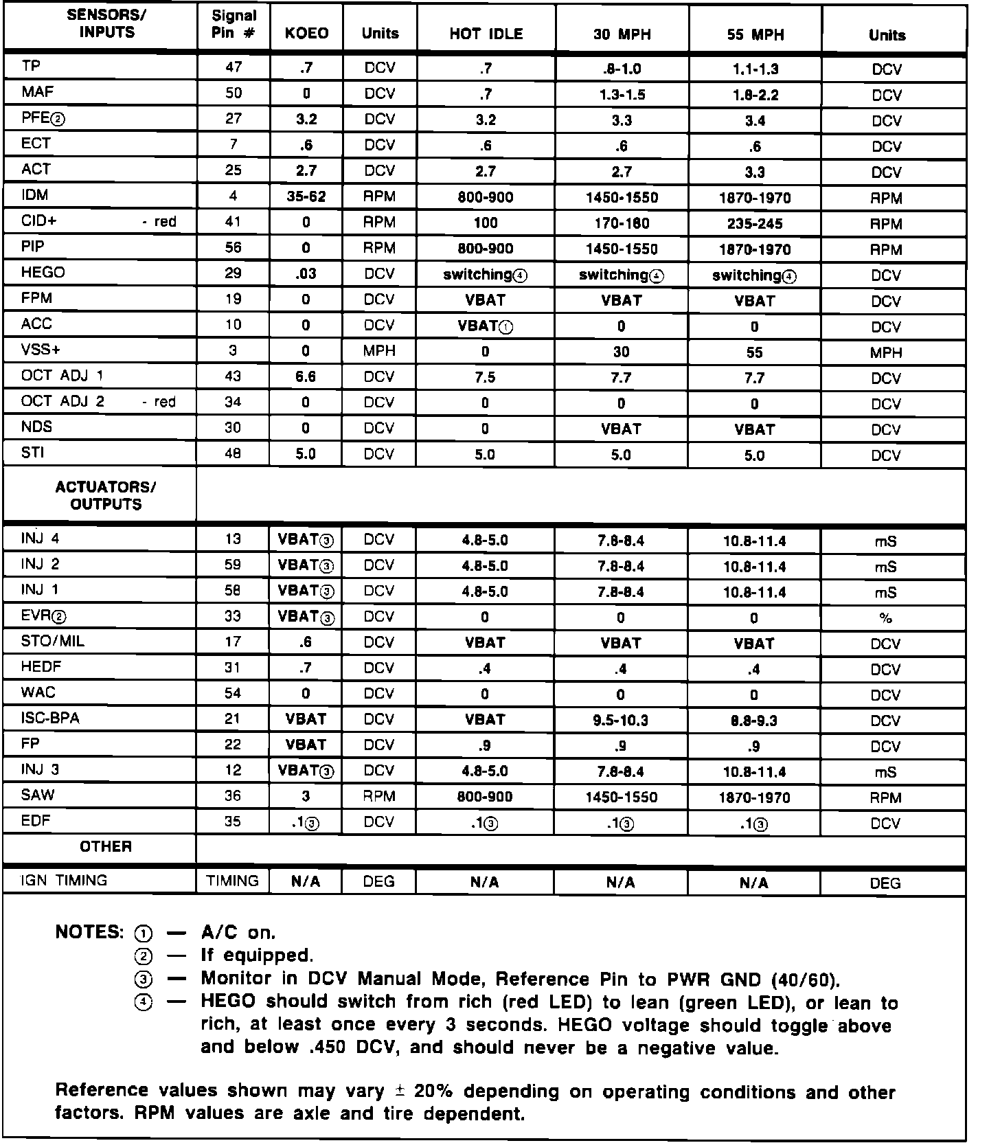5. Reference values shown in the charts may differ between vehicles due to component tolerances, driving conditions, weather, etc. These values were recorded at approximately 600 feet above sea level and ambient temperatures ranging from 50 to 70 degrees Fahrenheit. Some EEC-IV devices are temperature dependent and their values may vary greatly. Other values are calibration dependent and may also vary.