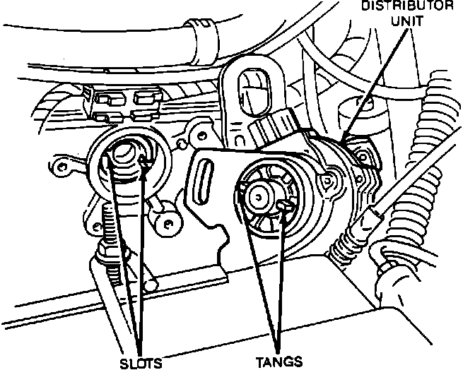 NOTE: When installing the distributor unit, make sure that the offset drive tangs engage with the camshaft slots.