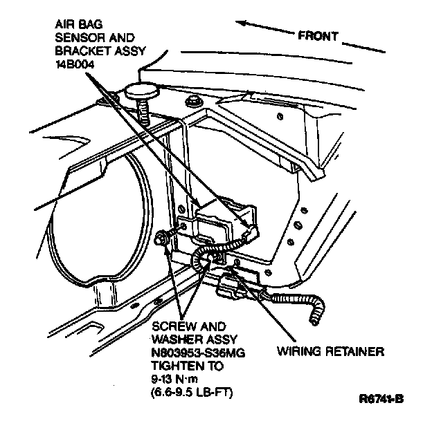 1. Position RH front sensor and wire lead in vehicle and secure sensor to RH fender apron with retaining screws. Tighten screws to 9-14 Nm (6.6-9.5 lb-ft).