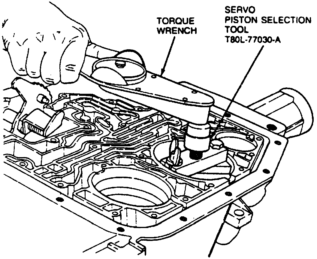 c. Install servo piston selection tool T80L-77030-A or equivalent and torque band apply bolt on tool to 50 in lbs.