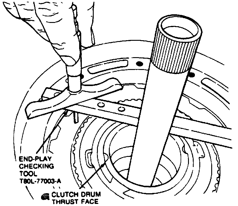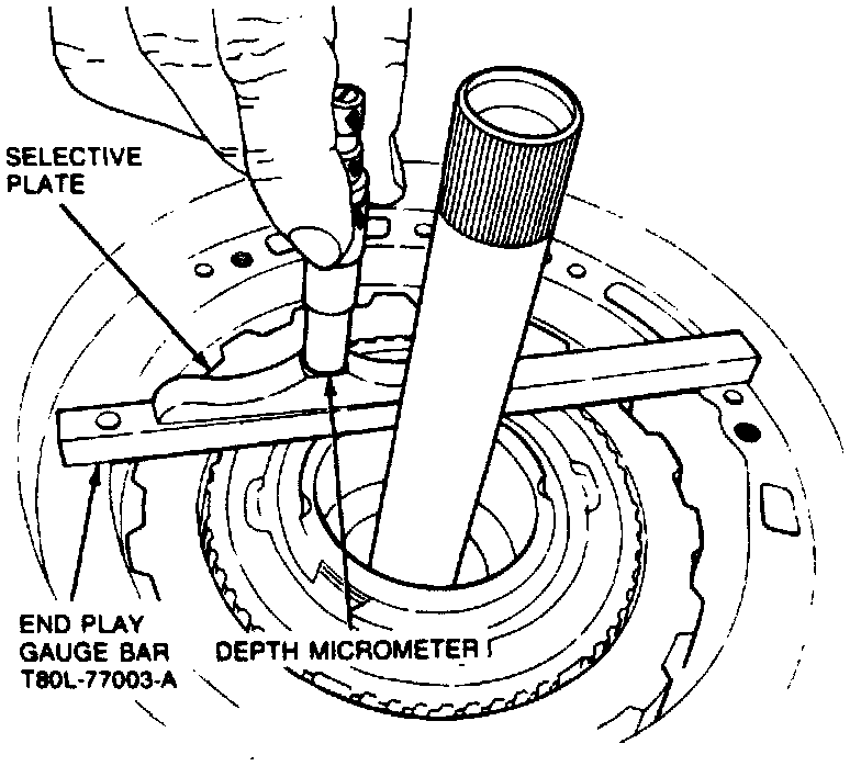22. Measure depth at reverse clutch drum thrust face, then measure again 180° opposite to obtain average measurement. Determine selective thrust washer required from the Selective Thrust Washer Application Chart.