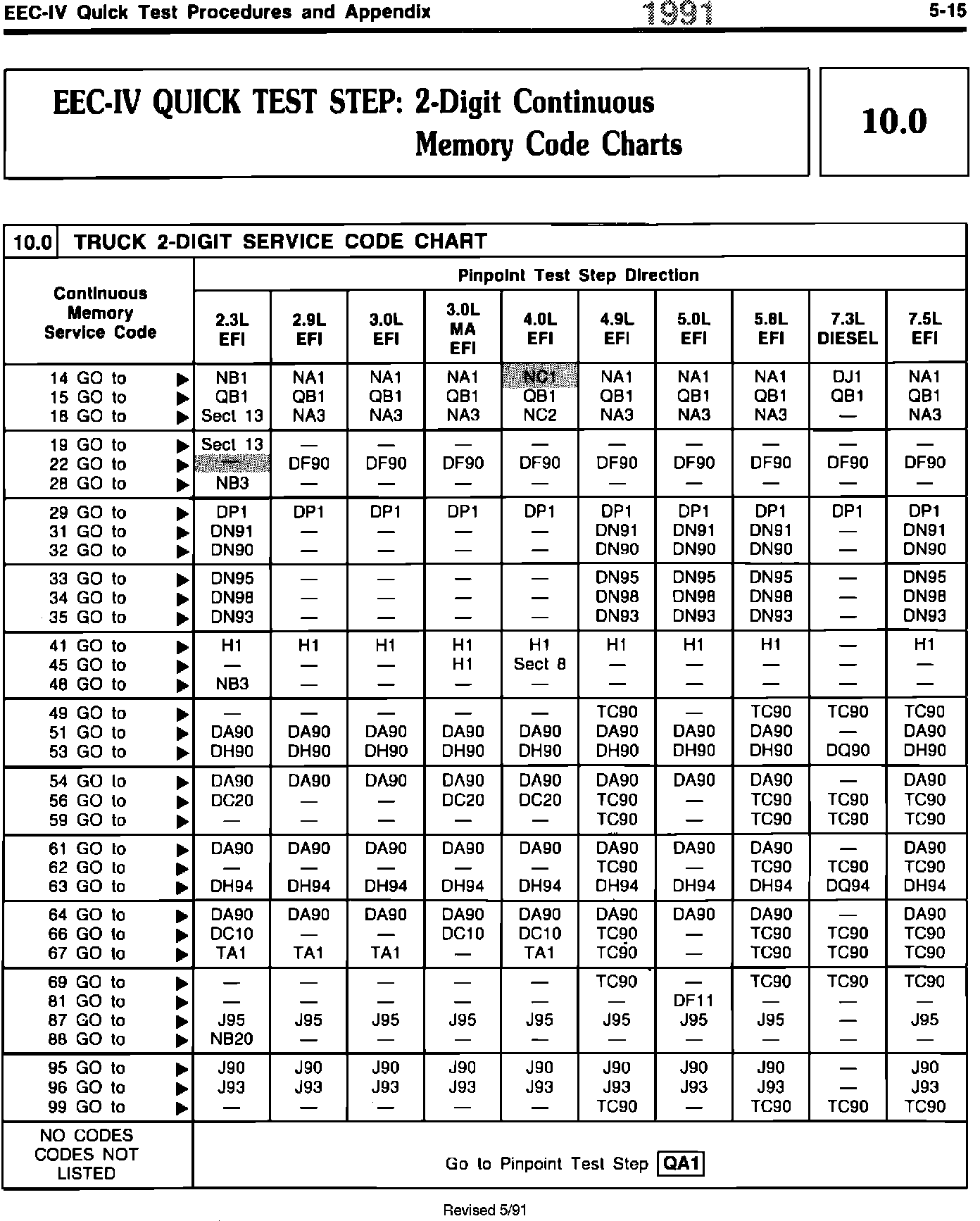 The EEC-IV Quick Test matrix in the 1991 Engine/Emissions Diagnosis Manual has been updated to include revised information. Pages 5-7, 5-9 through 5-11, 5-14, 5-15 and 5-18 are affected.