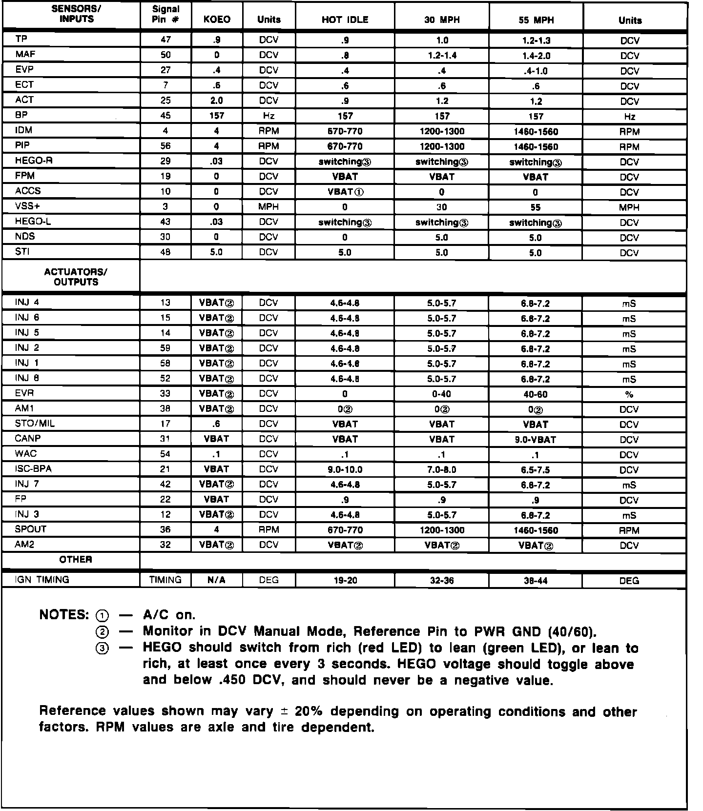 5. Reference values shown in the charts may differ between vehicles due to component tolerances, driving conditions, weather, etc. These values were recorded at approximately 600 feet above sea level and ambient temperatures ranging from 50 to 70 degrees Fahrenheit. Some EEC-IV devices are temperature dependent and their values may vary greatly. Other values are calibration dependent and may also vary.