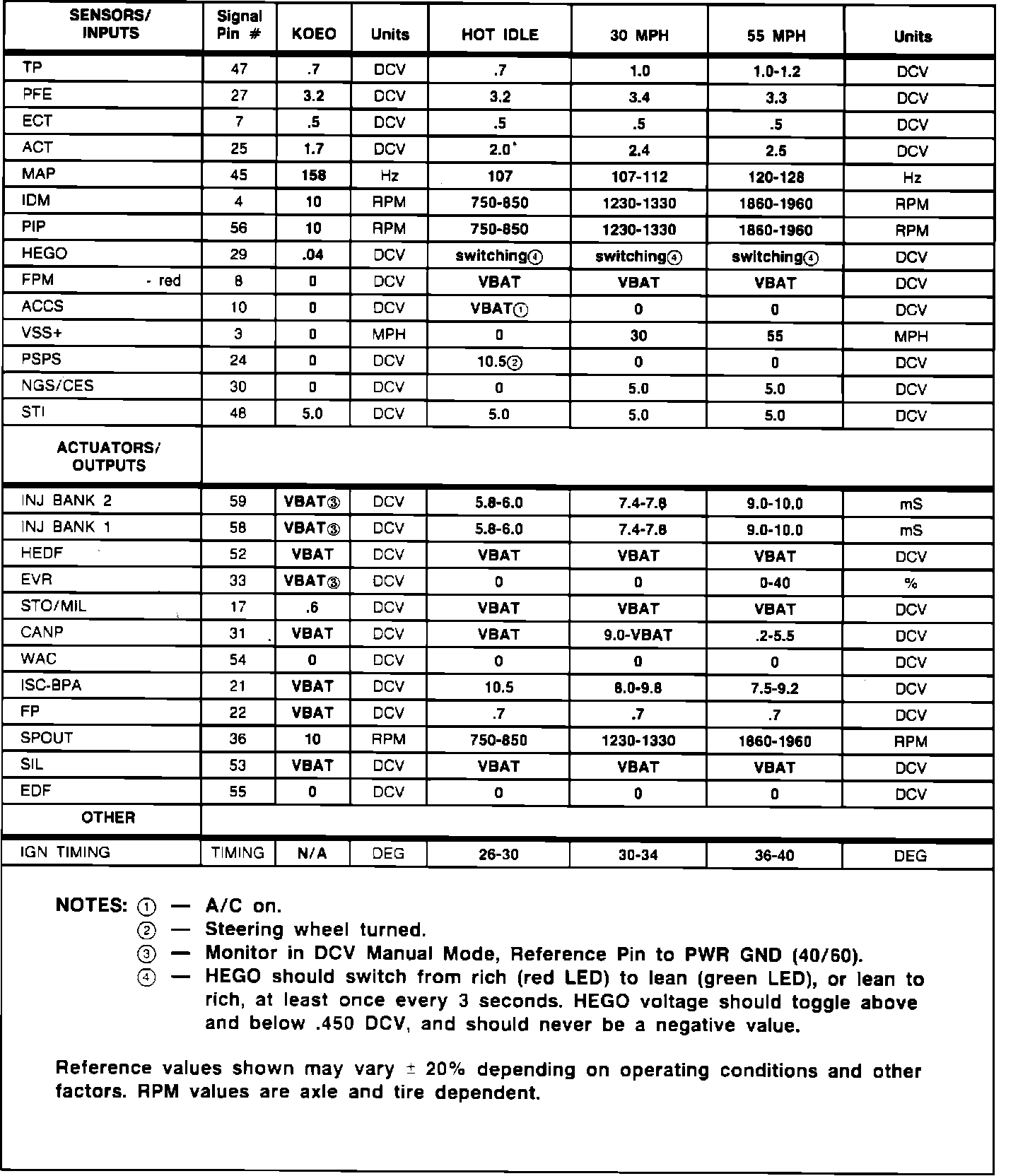 5. Reference values shown in the charts may differ between vehicles due to component tolerances, driving conditions, weather, etc. These values were recorded at approximately 600 feet above sea level and ambient temperatures ranging from 50 to 70 degrees Fahrenheit. Some EEC-IV devices are temperature dependent and their values may vary greatly. Other values are calibration dependent and may also vary.