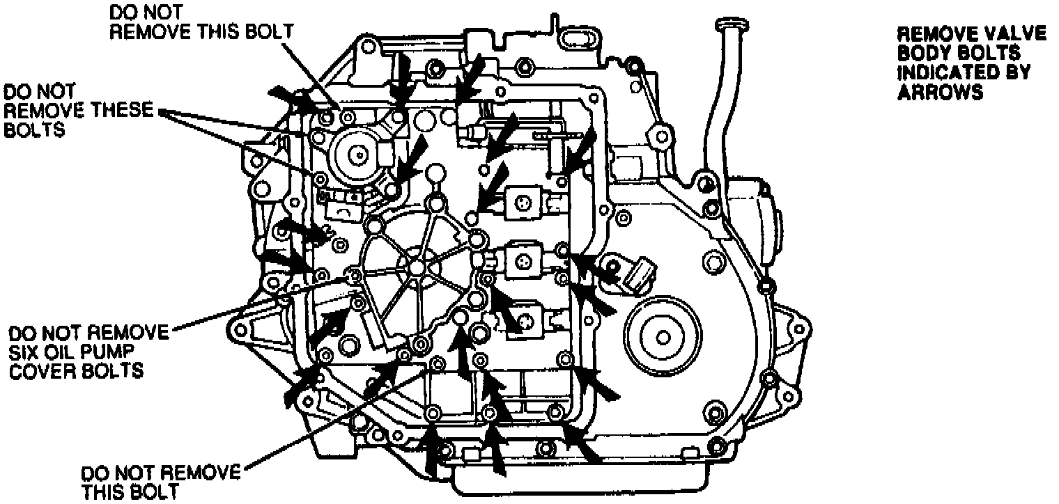 20. Remove valve body attaching bolts, then disengage linkage and remove valve body Do not remove oil pump cover attaching bolts.
