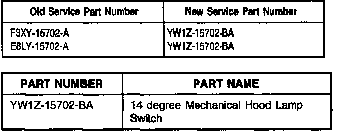 For vehicles requiring hood lamp switch replacement, replace the 14 degree Mercury switch with new 14 degree Mechanical switch. Replace hood lamp switch per the appropriate model year Workshop Manual as needed.