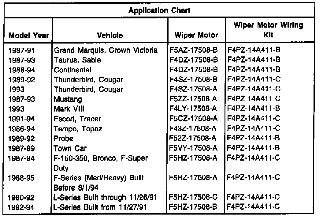 Replace the wiper motor with a revised wiper motor and use a Windshield Wiper Motor Service Kit to complete the installation. Refer to the Application Chart listed in this article for the proper application. Follow the detailed instructions included in the service kit.