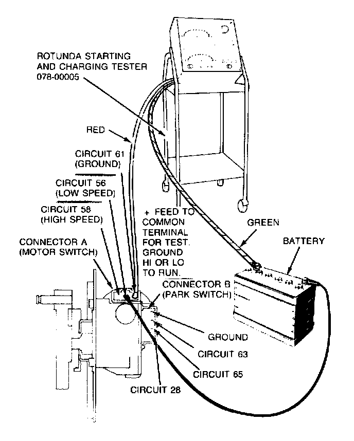 Disconnect the linkage from the motor and disconnect the electrical plug to test the motor on the vehicle. Connect the green lead from the test equipment, such as Rotunda 078-00005, Start and Charging Tester or equivalent, to the battery positive (plus) post. Connect the positive (red) lead from the tester to the common brush terminal. Attach a ground first to the low-speed connection and then to the high-speed connection at the connector plug as shown. In either case, the current draw should not exceed 3.5 amperes.