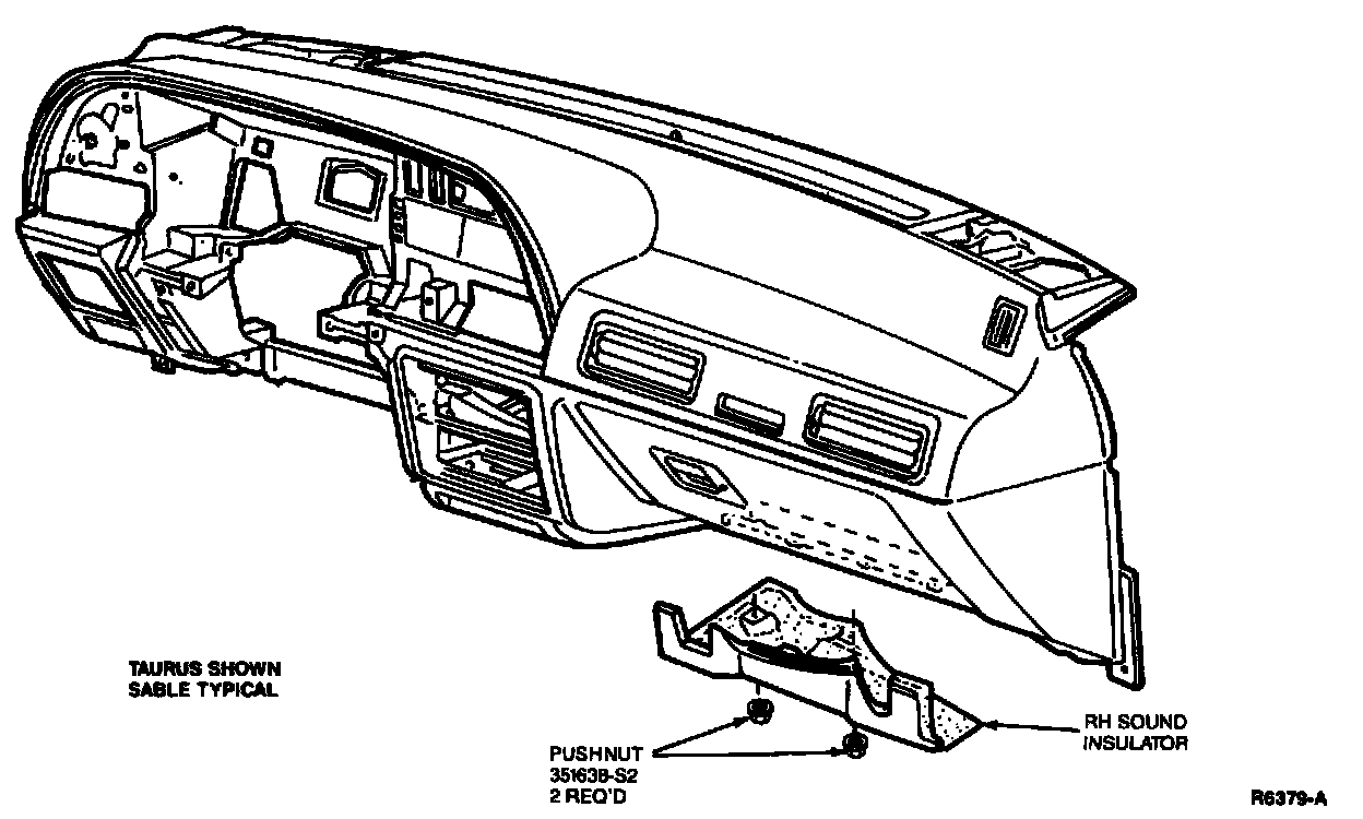 14. Remove sound insulator under glove compartment by removing two push nuts that secure insulator to studs on climate control case.