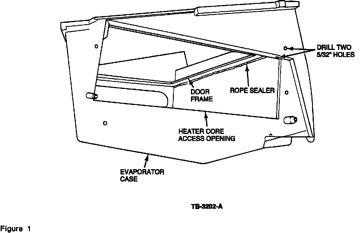 5. Hold the blend door frame firmly down against the evaporator case and drill two 5/32" (4 mm) holes as shown in Figure 1. Holding the door frame firmly in position, install a 5/32" X 3/8" (4 mm X 9.5 mm) pop rivet in each hole.