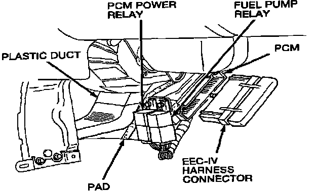NOTE: The Electronic Control Assembly (ECA) is located on the floor tunnel ahead of the floor console. The ECA power and fuel pump relays are mounted on the ECA bracket.