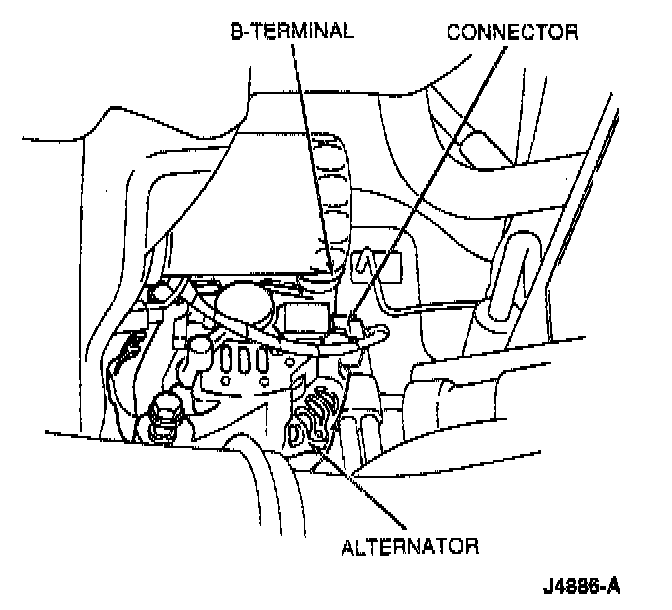 3. Disconnect the wiring terminals from the back of the alternator. The stator and the field wiring terminals are push-on type. After depressing the lock tab, the push-on type terminal should be pulled straight off to prevent damage.