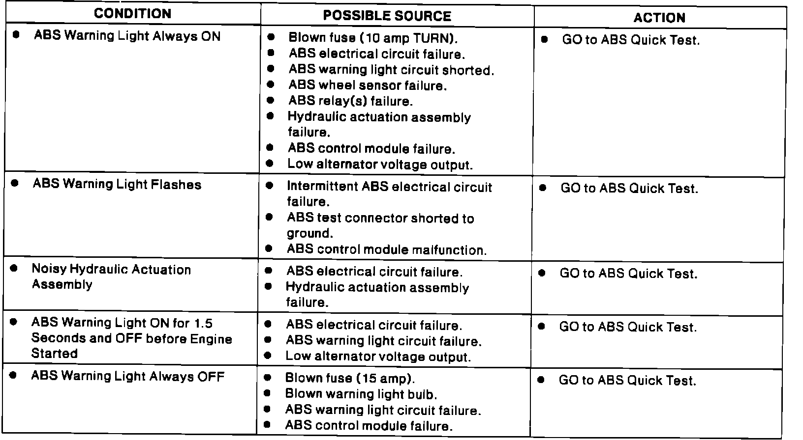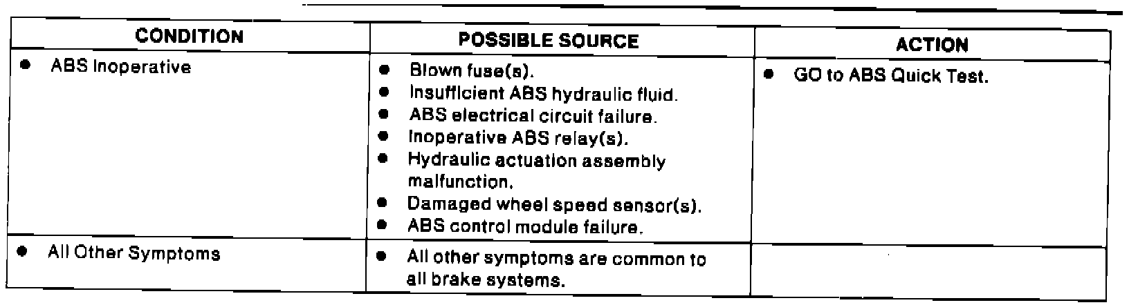 The hydraulic actuation assembly is non-serviceable and cannot be pressure checked. If any of its components fail, it must be replaced as a complete unit. Problems in other areas that may effect ABS system include suspension and steering components, tire wear and air pressure, wheel bearings and brake components. If inspection is satisfactory, refer to the symptom chart.