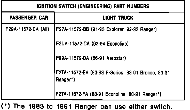 If the vehicle displays the subject symptoms and meets the following conditions, replace the ignition switch. Refer to the appropriate Car or Light Truck Service Manual (Section 13-04 for 1983-1990 Cars, Section 11-04 for 1991-1993 Cars and Section 13-05 for 1983-1990 Light Trucks, Section 11-05 for 1991-1993 Light Trucks) for removal and installation procedures. Refer to the Parts Block in this article for correct parts usage.