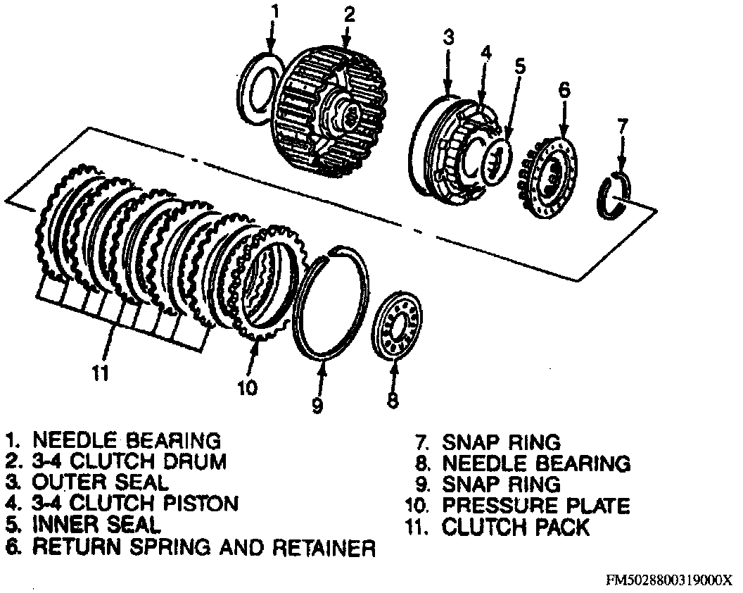 NOTE: Refer to the Exploded View Of 3-4 Clutch Assembly image when disassembling the 3-4 clutch.