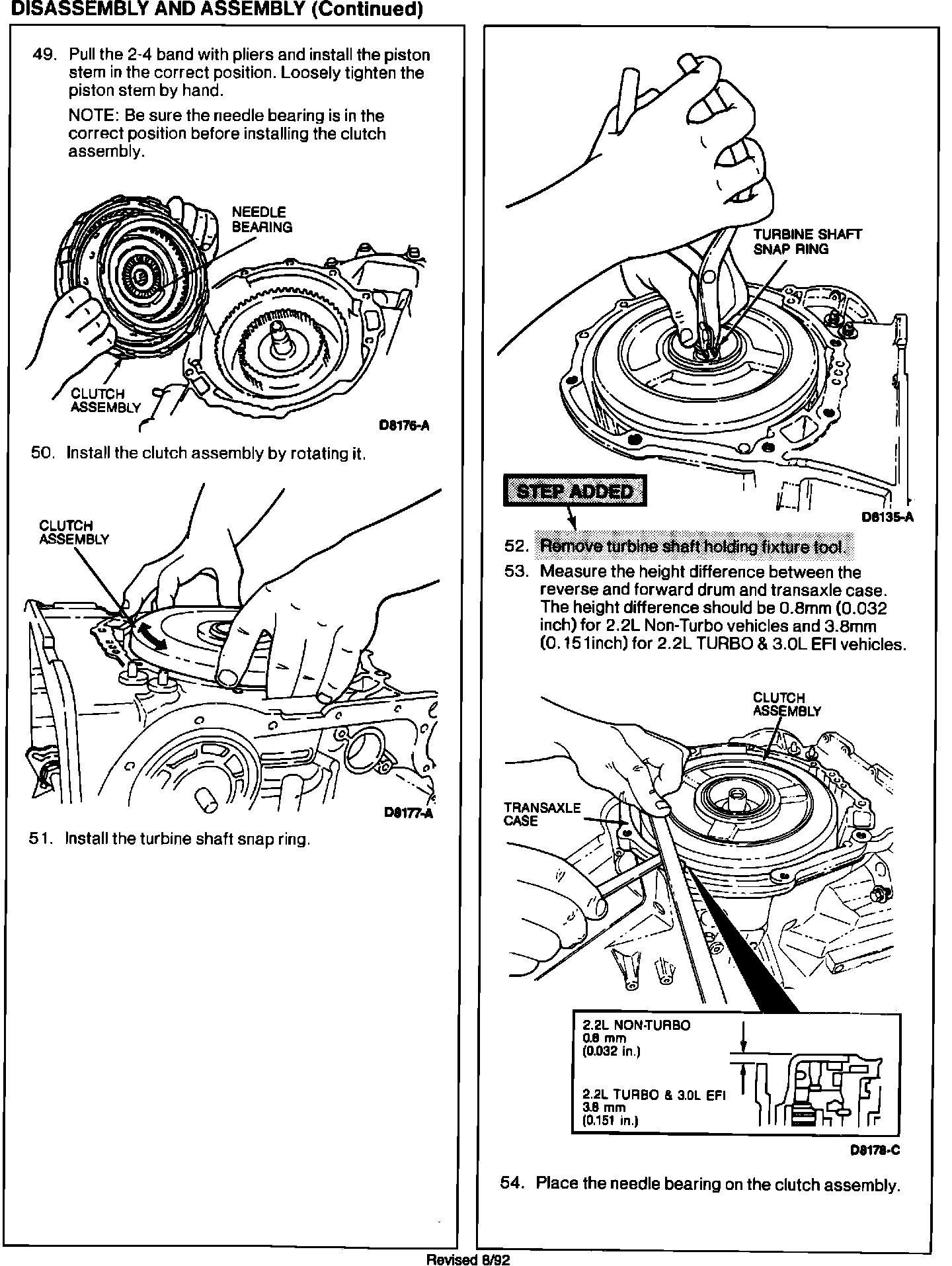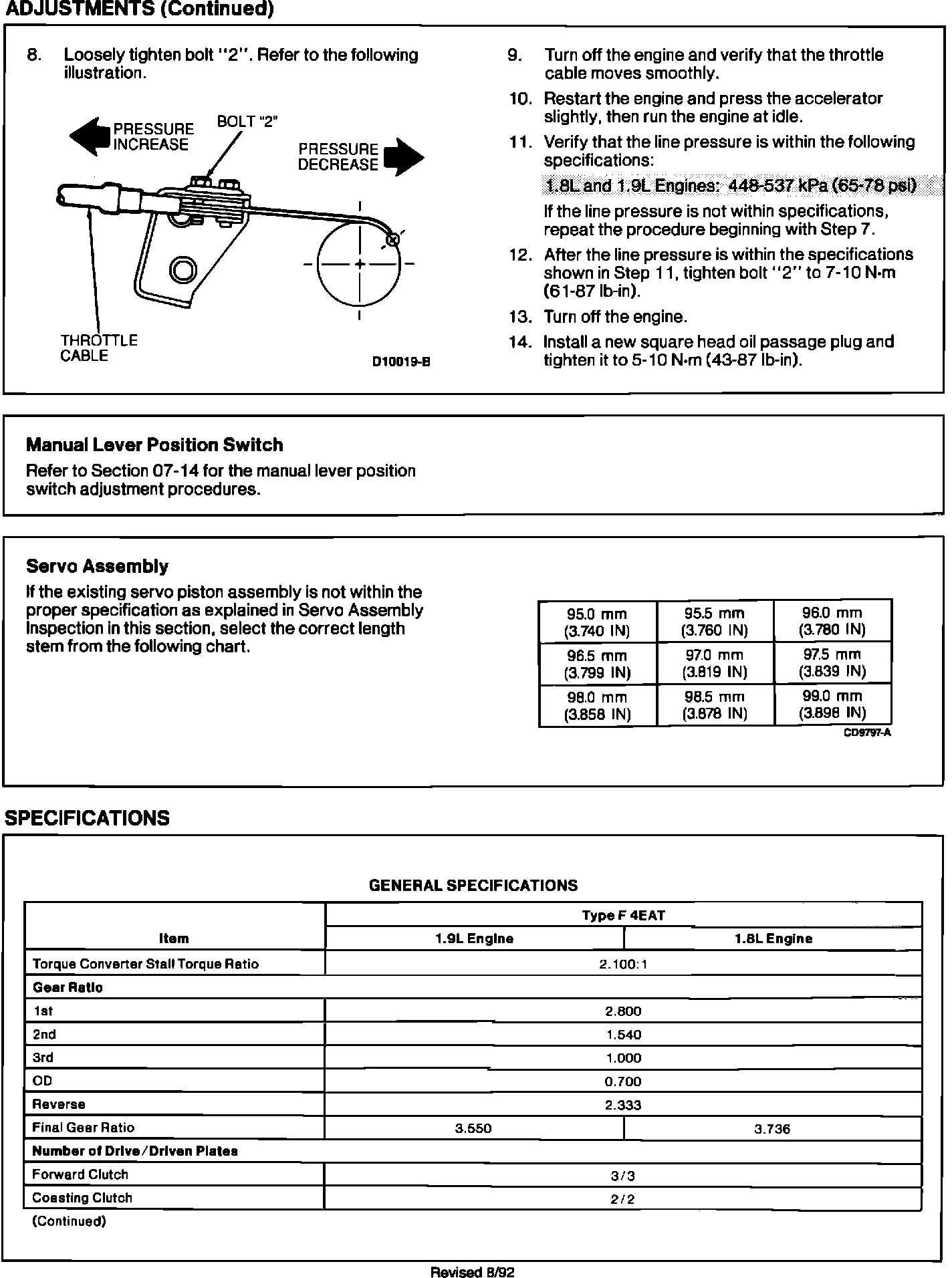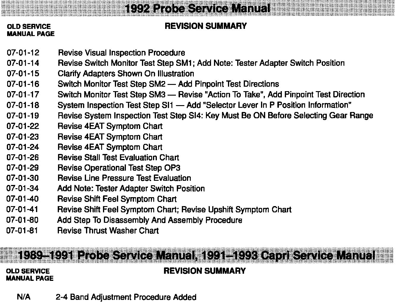 Also, the 1989-1991 Probe and 1991-1993 Capri Service Manuals are missing the 2-4 Band Adjustment Procedure. This procedure should be added to Automatic Transaxle, Adjustments.