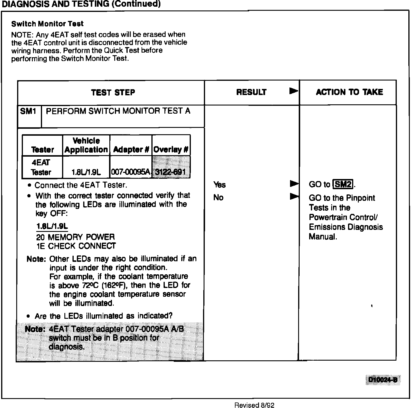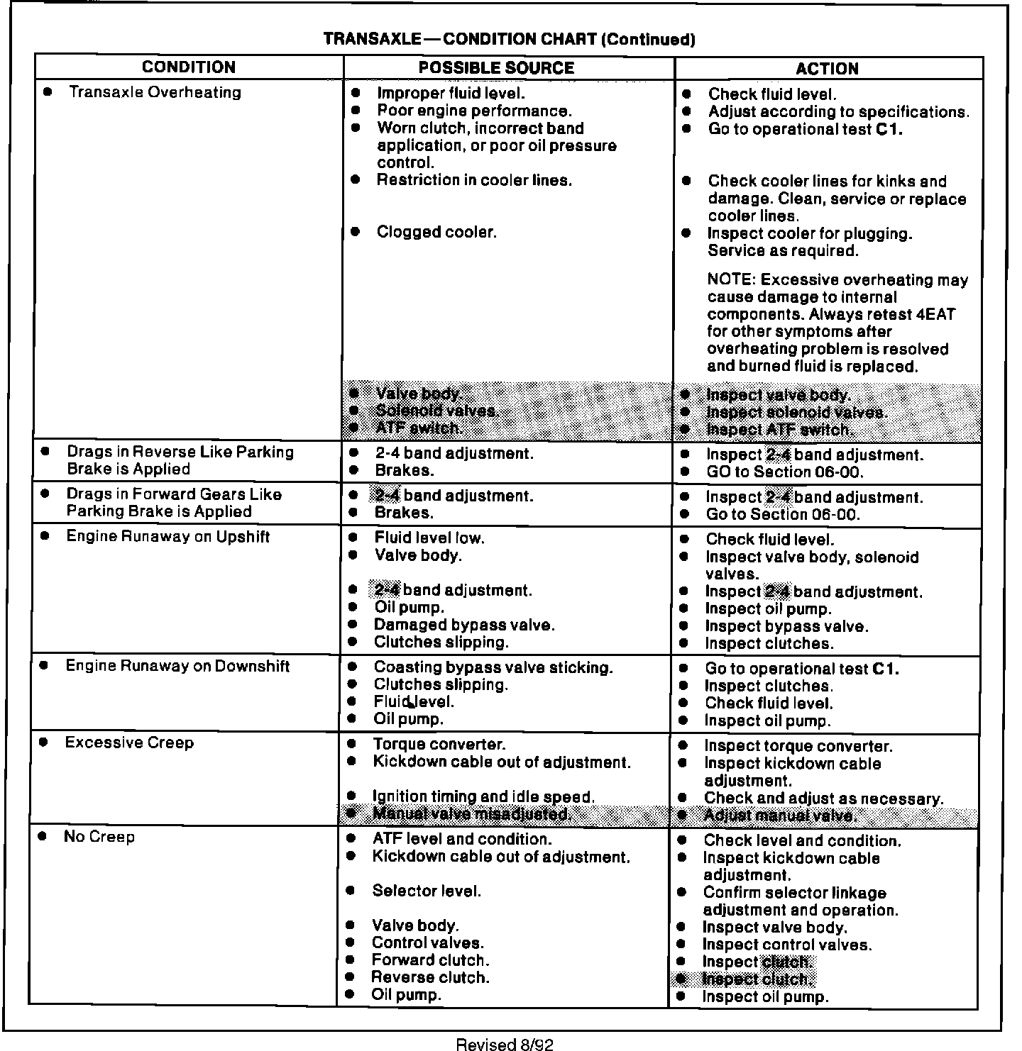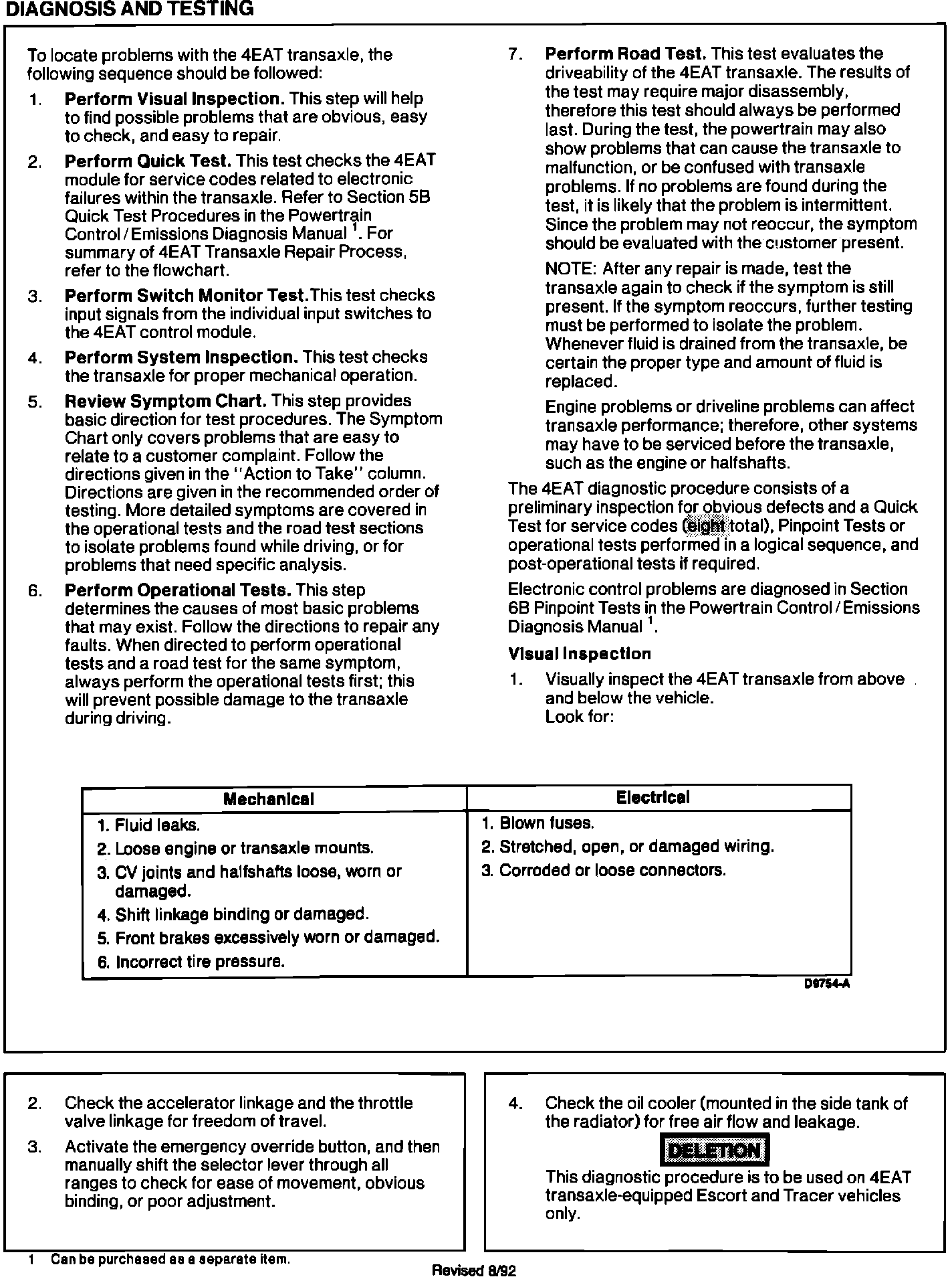 The 1992 Capri, 1992 and 1993 Escort/Tracer, and 1992 Probe Service Manuals contain 4EAT diagnostic information which requires revision. The following pages are affected: