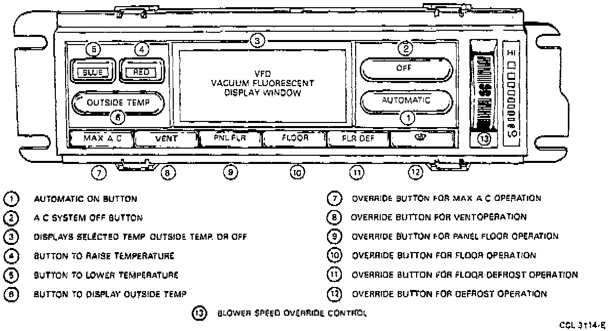 The EATC assembly is located in the instrument panel and consists of 10 push buttons, a variable blower speed control knob for manual input and a Vacuum Fluorescent Display (VFD) for displaying set temperature, ambient temperature, function, and diagnostic codes.