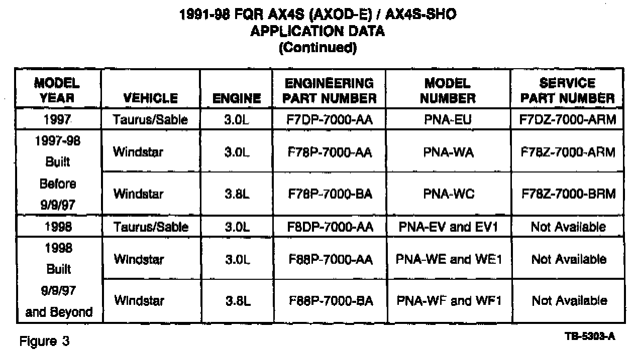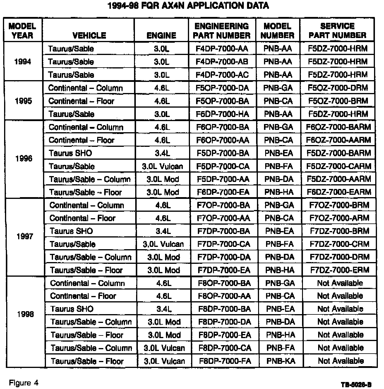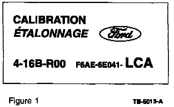 To verify a 3.8L Taurus vehicle does not have a Police package, check the calibration tag located on the driver's side door pillar. A vehicle with a Police package will have a "B" as the fourth character (Figure 1). This vehicle must contain the Police transaxle to function properly. If it does not, the transaxle must be replaced with the correct transaxle.