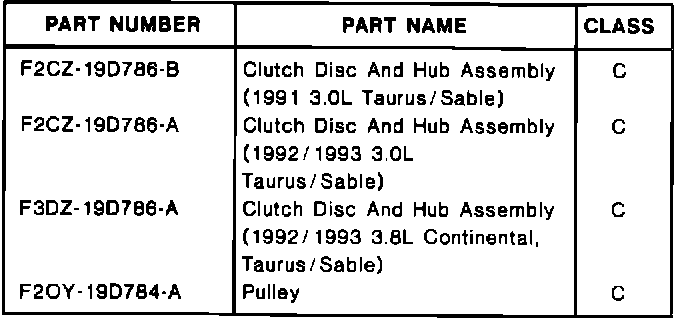 ^ If the pulley is the regular type, replace it with short type pulley (F20Y-19D784-A). Replace the existing clutch disc and hub assembly (21 tooth spline leaf spring type) with disc and hub assembly (F3DZ-19D786-A). This is a beaded 21 tooth spline rubber damped type.